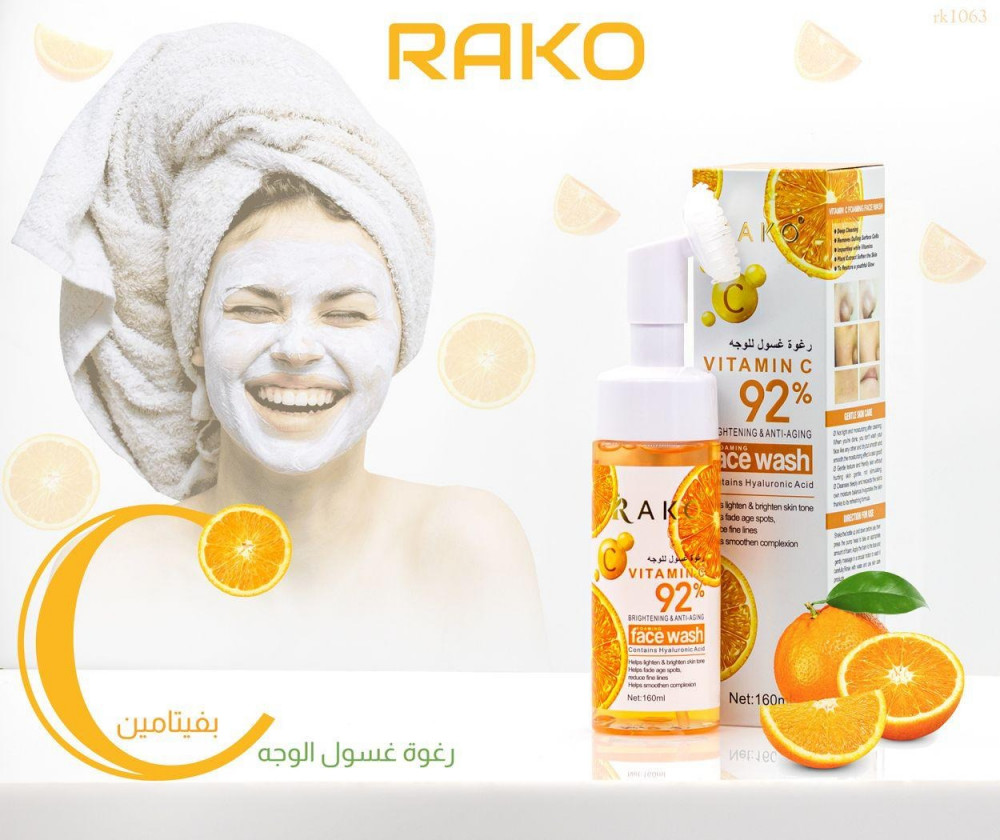 غسول كريم وجه رغوة بفيتامين سي 160 مل: اكتشف إشراقة ونضارة بشرتك مع غسولنا المبتكر. تركيبته الفريدة الغنية بفيتامين سي تعمل على تنظيف البشرة بعمق، وإزالة الشوائب والأوساخ، وتوحيد لون البشرة، وتقليل ظهور الخطوط الدقيقة والتجاعيد. استمتع ببشرة مشرقة ونضرة مع كل استخدام.