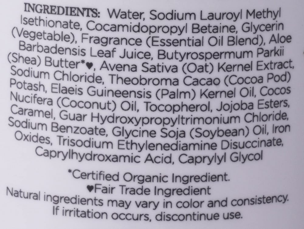 Water, Sodium Laroyl Methyl Isethionate, Cocamidopropyl Betaine, Glycerin (Vegetable), Aloe Barbadensis Leaf Juice, Shea Butter Butter, *_ Avena Sativa (Oat) Bran Extract, Sea Salt, Sodium Bran Kernelate, Sodium Shea Butter, Sodium Cocoa, Theobroma Cocoa (Cocoa) Ash Seeds, Tocopherol Berries, Jojoba Este. Caramel, Hydroxypropyltrimonium Chloride, Caprylyl Glycol, Caprylyhydroxamic Acid, Fragrance (Essential Oil Blend) *Certified Organic Ingredients. Fair trade ingredients.